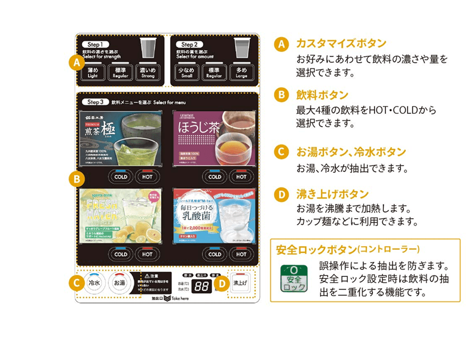 | HOT : 4メニュー ・ COLD : 4メニュー ・ お湯・冷水 | ||