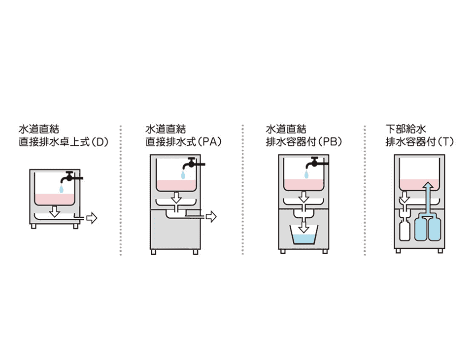 | Tタイプ | 給排水方式 | 下部給水 / 容器排水 |