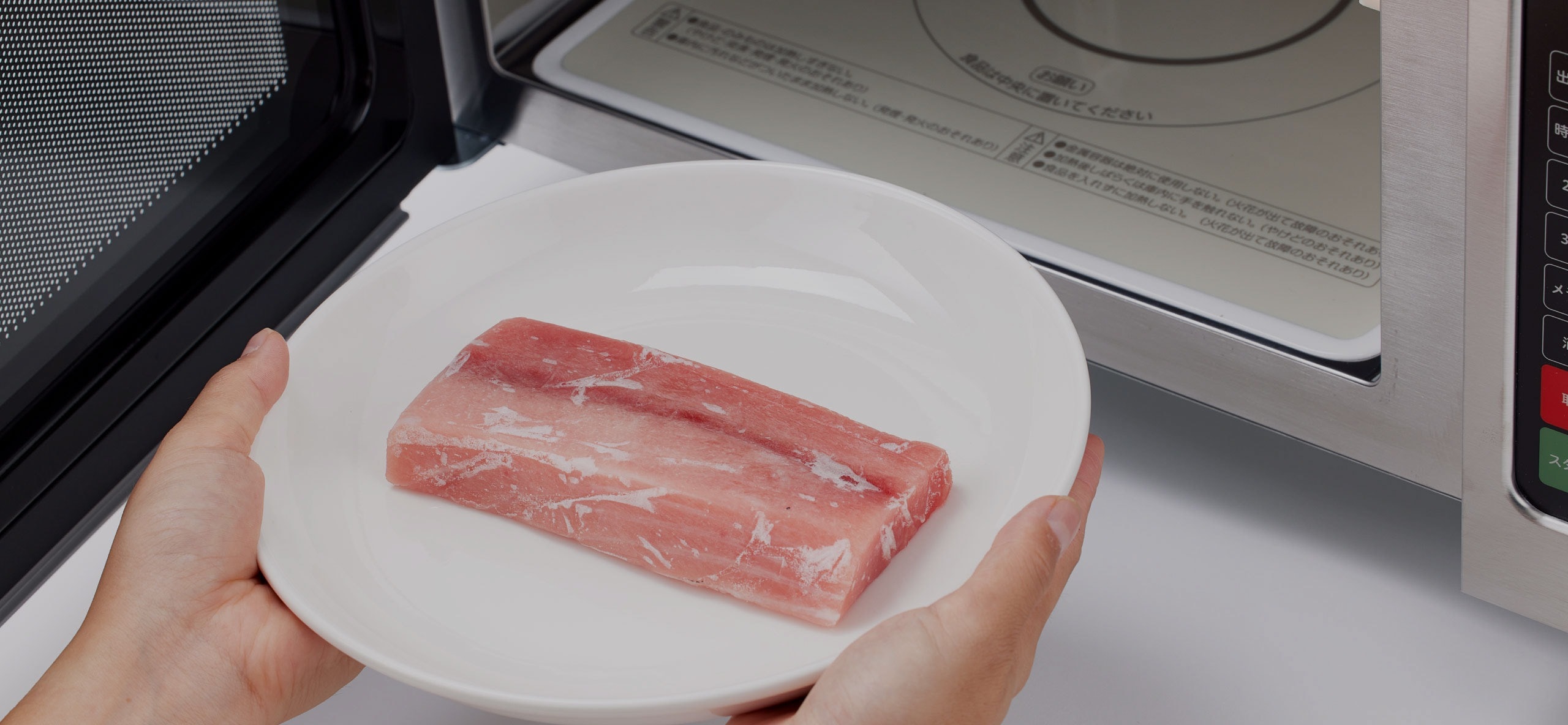 流水解凍に比べて解凍時間を短縮できるだけでなく、低出力で食材へのダメージを抑え、味や食感の劣化を抑えます。